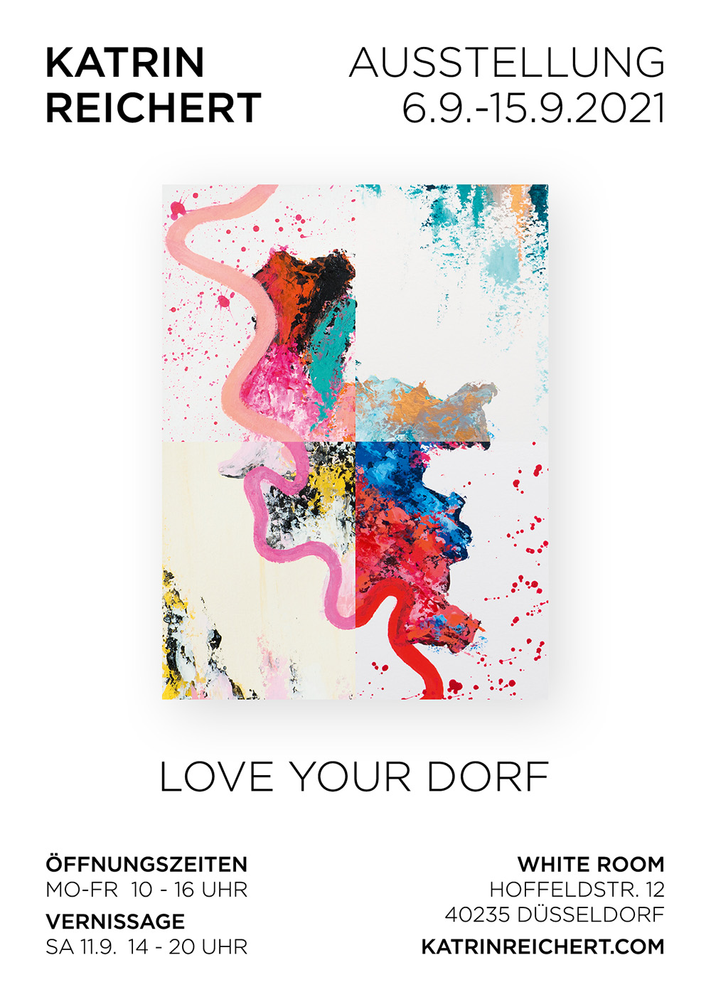 Die Ausstellung "Love your Dorf" von Katrin Reichert war in der vom 6. September bis zum 15. September 2021 im White Room Düsseldorf zu sehen. Sie zeigte eine unberechenbare, impulsive und abstrakte Seite der Stadt Düsseldorf. Man konnte in eine kunterbunte Welt eintauchen und verschiedene Städte in knalligen Farben erleben.